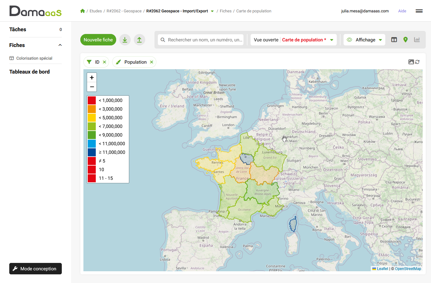 Créez des tableaux de bord visuels sans effort. Le système peut désormais générer une échelle de couleurs automatique (ex: densité de population) sur les zones géographiques. Les valeurs s’affichent directement sur les formes au zoom.