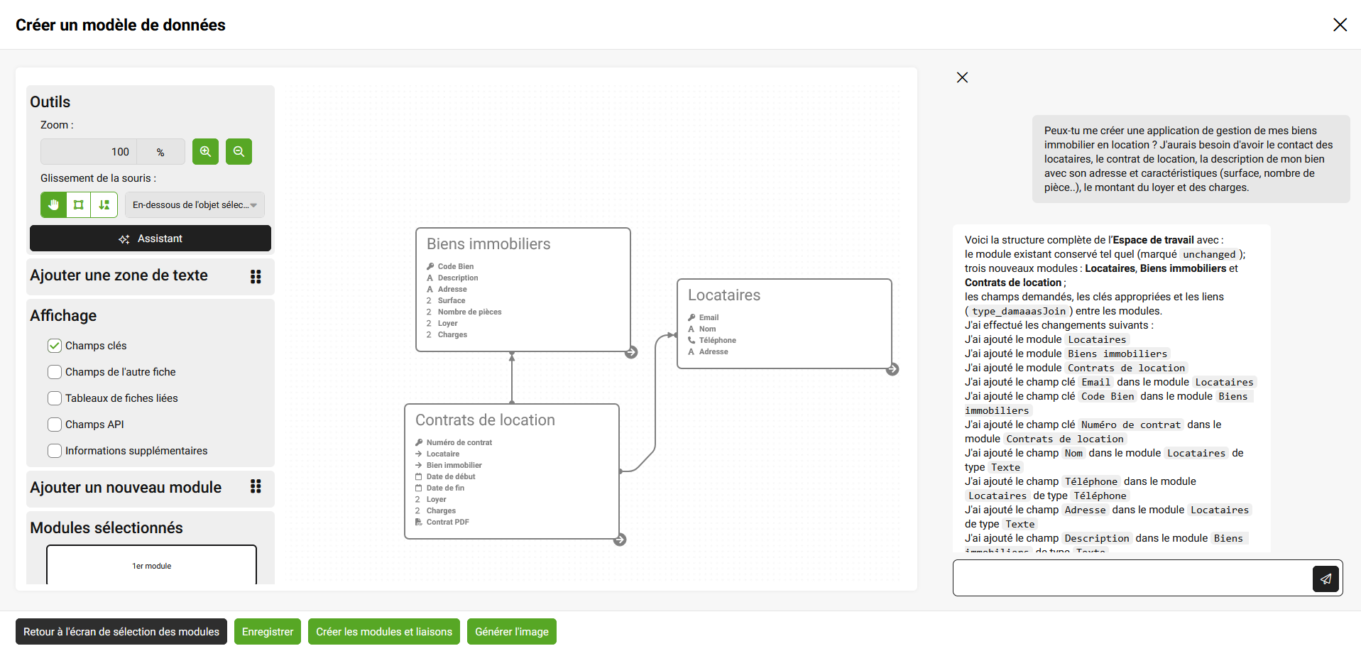 Accélérez la phase de brainstorming ! Vous pouvez désormais décrire votre besoin à l’assistant intelligent pour qu’il dessine automatiquement un modèle de données (modules et liaisons).
