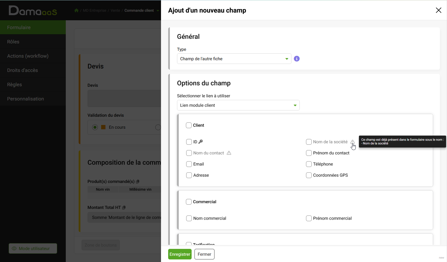 Lors de la conception de formulaires, les champs provenant d’une autre fiche qui sont déjà utilisés apparaissent désormais en gris avec une étoile, et un tooltip indique leurs libellés locaux. Cela évite les doublons accidentels tout en permettant l’ajout si nécessaire.