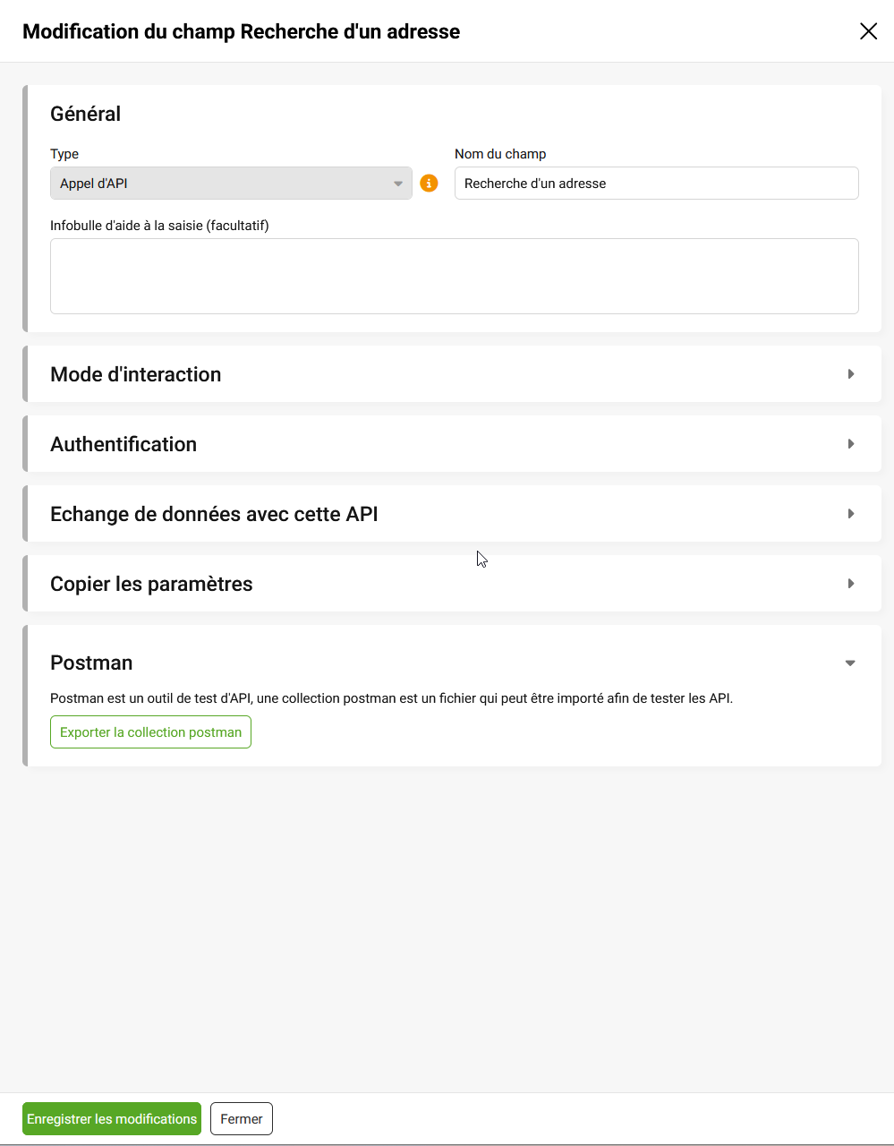 Générez automatiquement un fichier JSON contenant tous les paramètres de votre champ Appel d’API, prêt à être importé en collection Postman.